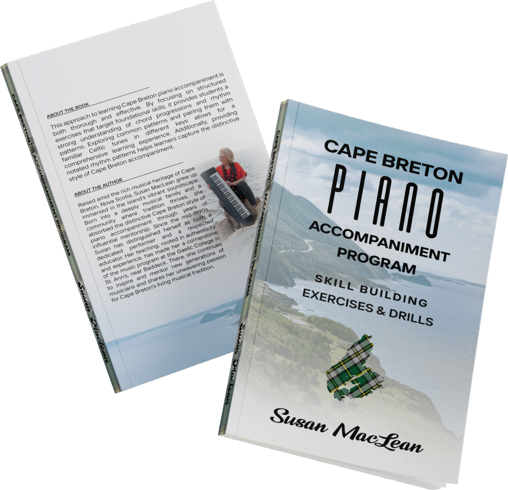 This book is a comprehensive Cape Breton piano accompaniment resource designed for all levels of learners and piano teachers. There are almost 100 pages of strategies, drills, exercises, patterns, and rhythms to build one’s foundational skills for learning Cape Breton piano. It is paired with an interactive website offering audio practice tracks at fast and slow speeds and video demonstrations to support learning by ear. Susan’s years of experience in traditional Cape Breton music has inspired this much sought after resource.